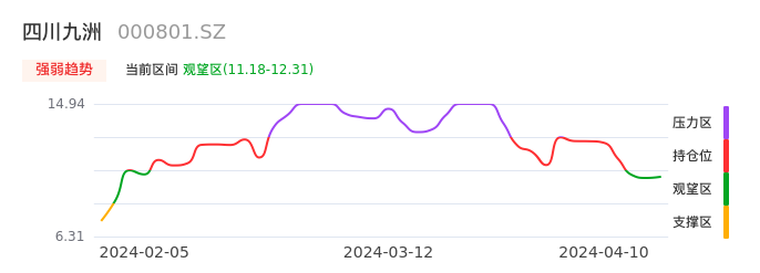 我们来看一下该股的九方特色指标强弱趋势的情况:四川九洲近日从持仓区下穿到观望区,股价出现持续调整。短期出现止跌态势,后续重点关注能否再次站上多空分界点:12.31元。如未能有效突破则可能进入新一轮空头行情。