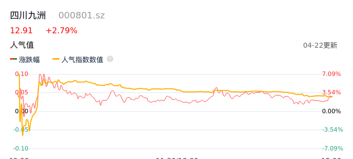 04月22日,四川九洲收报12.91,股价涨幅2.79%,成交金额13.03亿元,换手率9.84%。