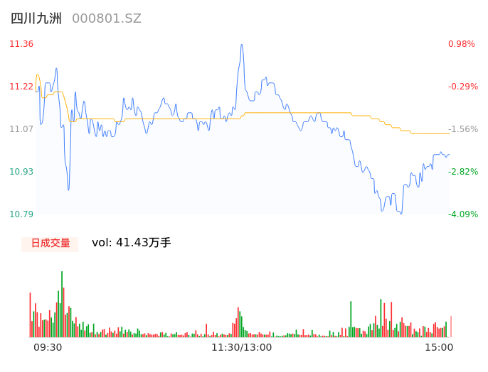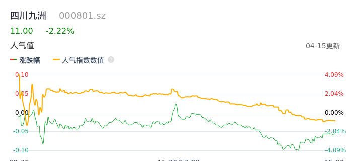 04月15日,四川九洲收报11.00,股价涨幅-2.22%,成交金额4.58亿元,换手率4.05%。