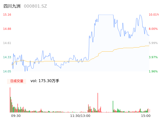 04月25日,四川九洲收报14.75,股价涨幅7.04%,成交金额25.51亿元,换手率17.14%。