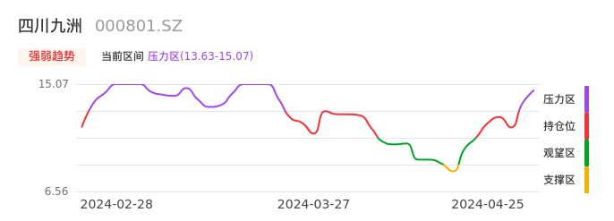 我们来看一下该股的九方特色指标强弱趋势的情况:四川九洲近日从持仓区进入压力区。股价出现一波快速拉升行情,目前上升动能较为充足可继续持股。注意今日上方压力位:15.07元是否能有效突破。