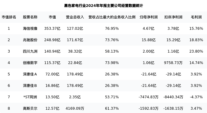 四川九洲最新报告期数据为年报,下表汇总了黑色家电行业内市值靠前的公司年报主要经营数据