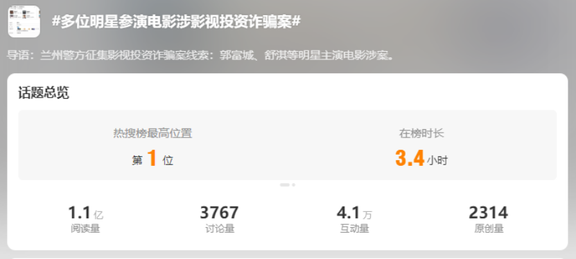 1月22日下午,话题#多位明星参演电影涉影视投资诈骗案#冲上微博热搜第一,引发诸多网友热议。据了解,上述案件涉及影视传媒公司共4家,涉及电影共12部,郭富城、杨千嬅主演的电影《麦路人》,以及舒淇主演的电影《痞子爱人》位列其中。