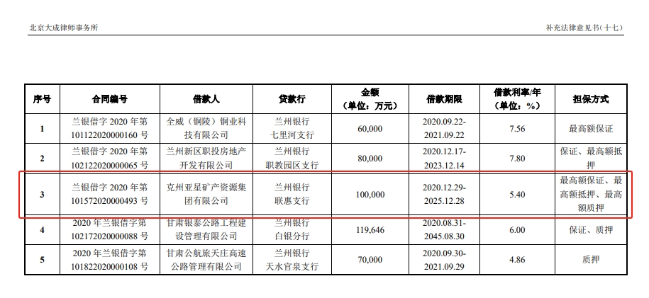 记者查阅兰州银行IPO期间,北京大成律师事务所出具的关于兰州银行股份有限公司首次公开发行股票并上市之补充法律意见书(十七),发现2020年12月29日,兰州银行联惠支行新增一笔发放给克州亚星的10亿元贷款,借款期限为5年,担保方式包括最高额保证、最高额抵押和最高额质押。