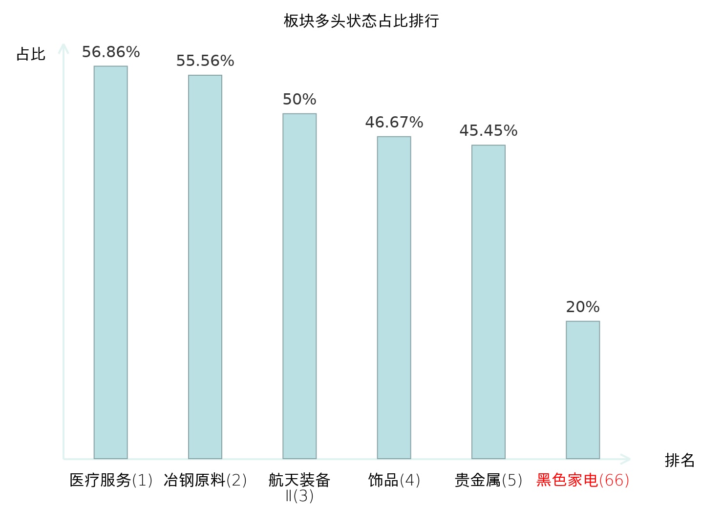 全市场所有行业板块中主力多头状态占比排名中,医疗服务板块位居第一。旅游及景区板块名次提升最快,较昨日上升61位。