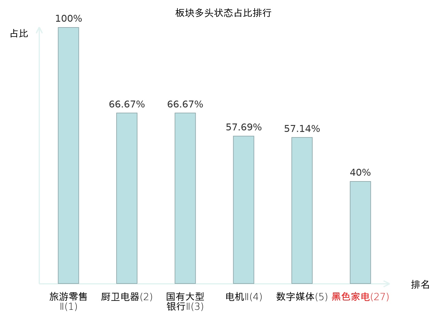 全市场所有行业板块中主力多头状态占比排名中,旅游零售Ⅱ板块位居第一。汽车服务板块名次提升最快,较昨日上升70位。