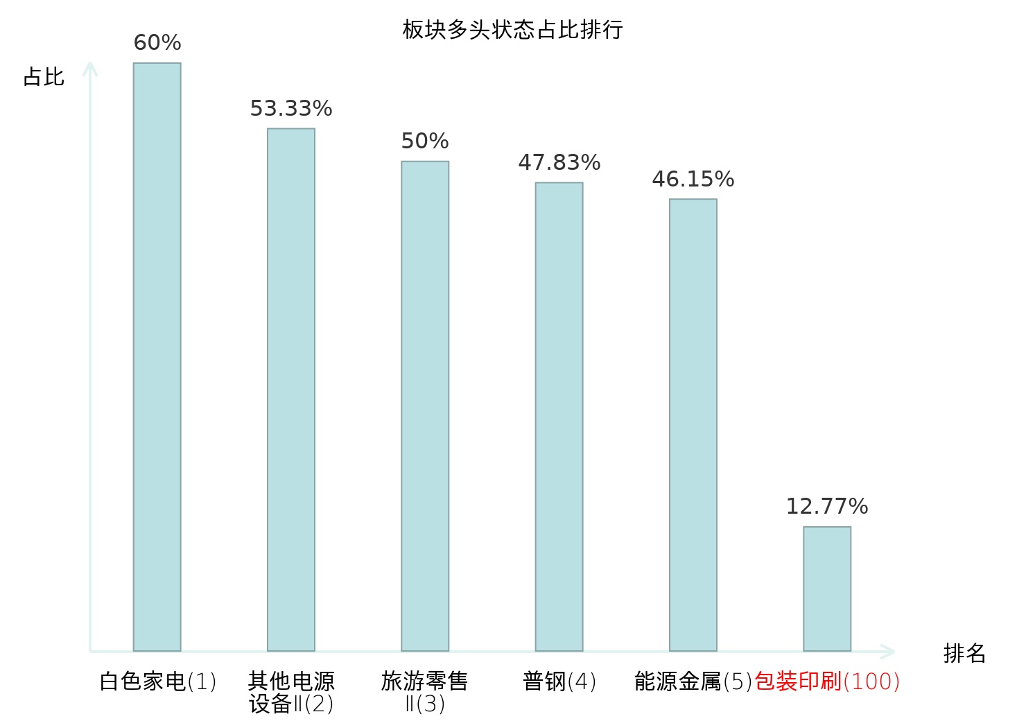 全市场所有行业板块中主力多头状态占比排名中,白色家电板块位居第一。照明设备Ⅱ板块名次提升最快,较昨日上升55位。