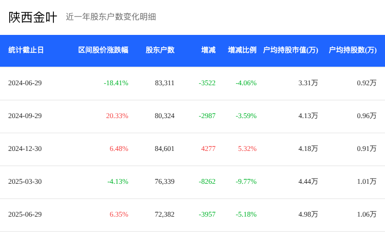 截至2025年6月30日,陕西金叶(000812)的股东户数为7.24万,相比上一季度减少了5.18%。与此同时,户均持股数量为5.47万股,环比增加了12.16%,户均持股市值达到了4.98万元。这表明,股东户数减少的同时,单个股东的持股数量和市值有所增加,显示出股东结构的集中度提升。