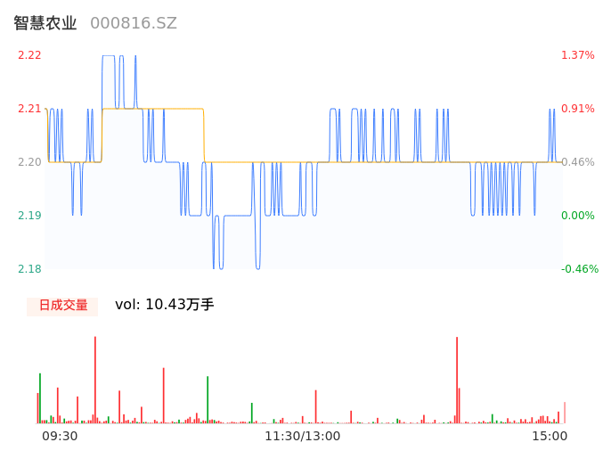 04月23日,智慧农业收报2.20,股价涨幅0.46%,成交金额2296.37万元,换手率0.73%。