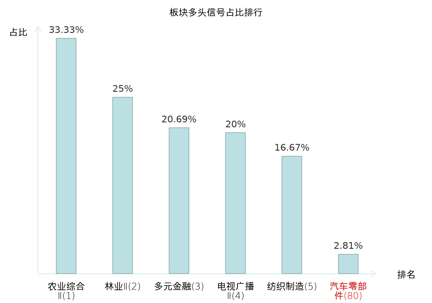 全市场所有行业板块中主力多头信号占比排名中,农业综合Ⅱ板块位居第一。农业综合Ⅱ板块名次提升最快,较昨日上升127位。
