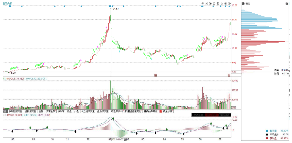 上图可以看到在2022 年1 月7 日,岳阳兴长下跌初始,不管是套牢筹码还是获利筹码都存在多个筹码峰,继续看下图: