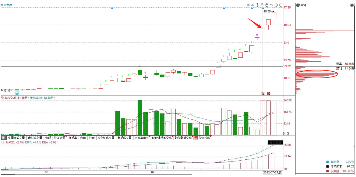 中大力德在 2022 年 7 月上旬于 19-20 元区域形成密集筹码区域。继续看下图: