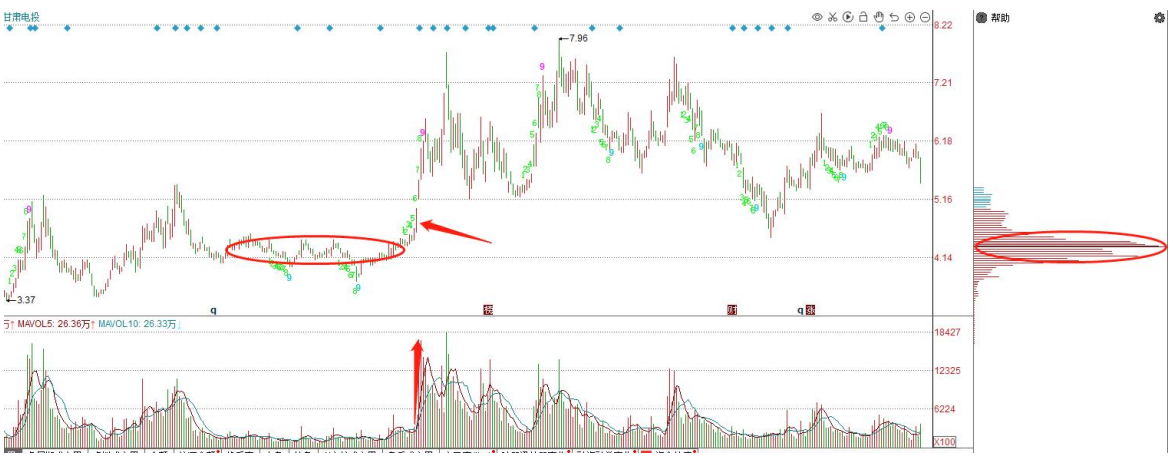 上图是甘肃电投2021 年 4 月 20 日-9 月 27 日的走势,从图形上股价先是长期经历横盘调整,筹码成本大量积聚在4.30元附近,随后9月2日放量涨停突破。快速脱离单峰密集成本区域,后续涨幅超过40%。