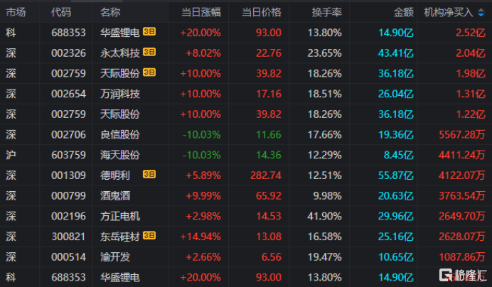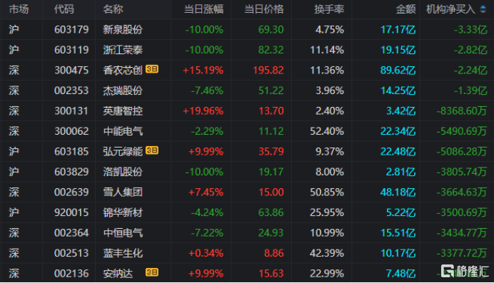 龙虎榜中涉及机构专用席位的个股中,当日净卖出额前三为新泉股份浙江荣泰杰瑞股份,分别为3.33亿元、2.82亿元、1.39亿元。