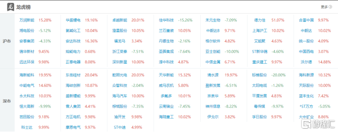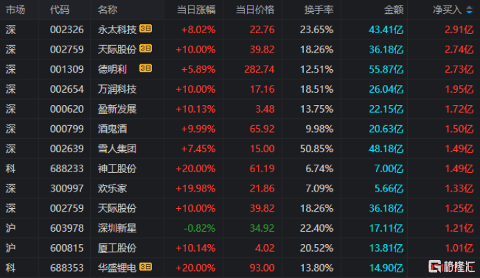 龙虎榜单日净买入额前三为万润科技盈新发展酒鬼酒,分别为1.95亿元、1.72亿元、1.5亿元。