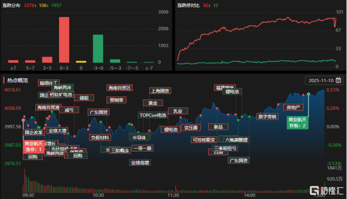 11月10日,沪深两市成交额2.17万亿,较上一个交易日放量1754亿。板块方面,大消费、氟化工、锂电池、培育钻石等板块涨幅居前,而船舶制造、机器人等板块下挫。