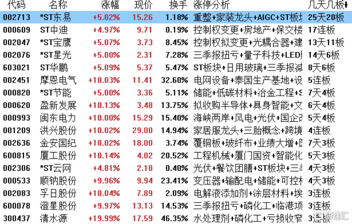 高位股方面,*ST东易25天20板,ST中迪17连板,*ST宝鹰13天11板,*ST星光14天6板,ST华鹏8天6板,摩恩电气5连板,*ST节能7天4板,盈新发展6天4板,闽东电力5天4板,洪兴股份4连板。