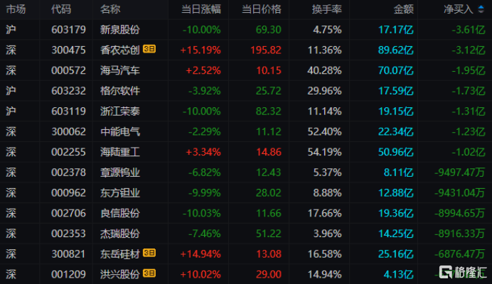 龙虎榜单日净卖出额前三为新泉股份海马汽车格尔软件,分别为3.61亿、1.95亿元、1.73亿元。