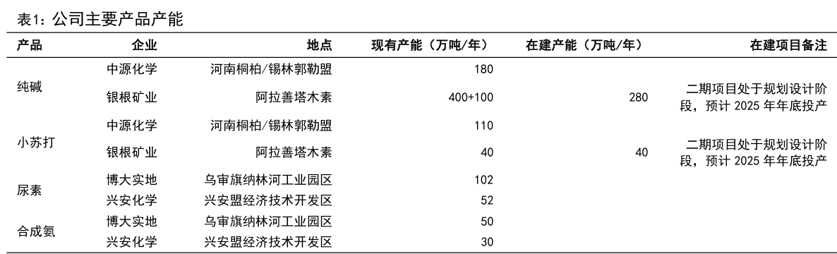 公司纯碱在产产能680万吨/年,小苏打在产产能150万吨/年,尿素在产产能154万吨/年,纯碱、小苏打产能位居国内前列。公司阿拉善天然碱项目规划建设纯碱产能780万吨/年、小苏打产能80万吨/年,其中一期规划建设纯碱500万吨/年、小苏打40万吨/年,二期规划建设纯碱280万吨/年、小苏打40万吨/年。项目一期已于2023年6月投料试车,已实现达产达标;项目二期已于2023年12月启动建设,计划2025年底建成。全部建成后远兴能源将具备960万吨纯碱、190万吨小苏打,成为纯碱、小苏打行业绝对龙头,同时成本有望进一步降低。