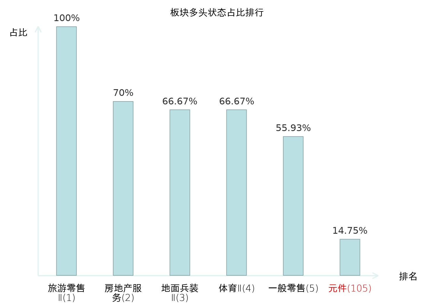 全市场所有行业板块中主力多头状态占比排名中,旅游零售Ⅱ板块位居第一。林业Ⅱ板块名次提升最快,较昨日上升68位。