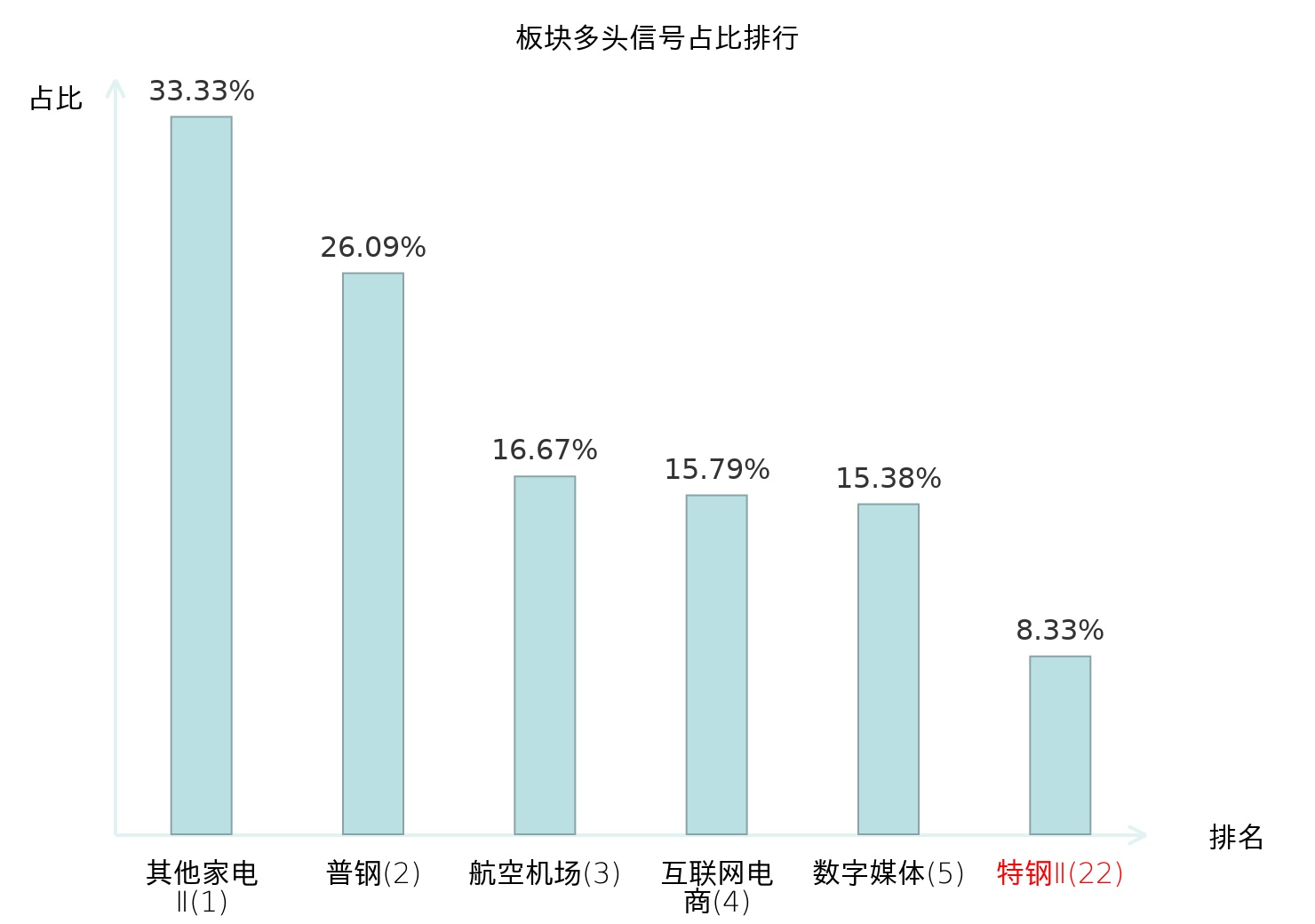 全市场所有行业板块中主力多头信号占比排名中,其他家电Ⅱ板块位居第一。其他家电Ⅱ板块名次提升最快,较昨日上升129位。