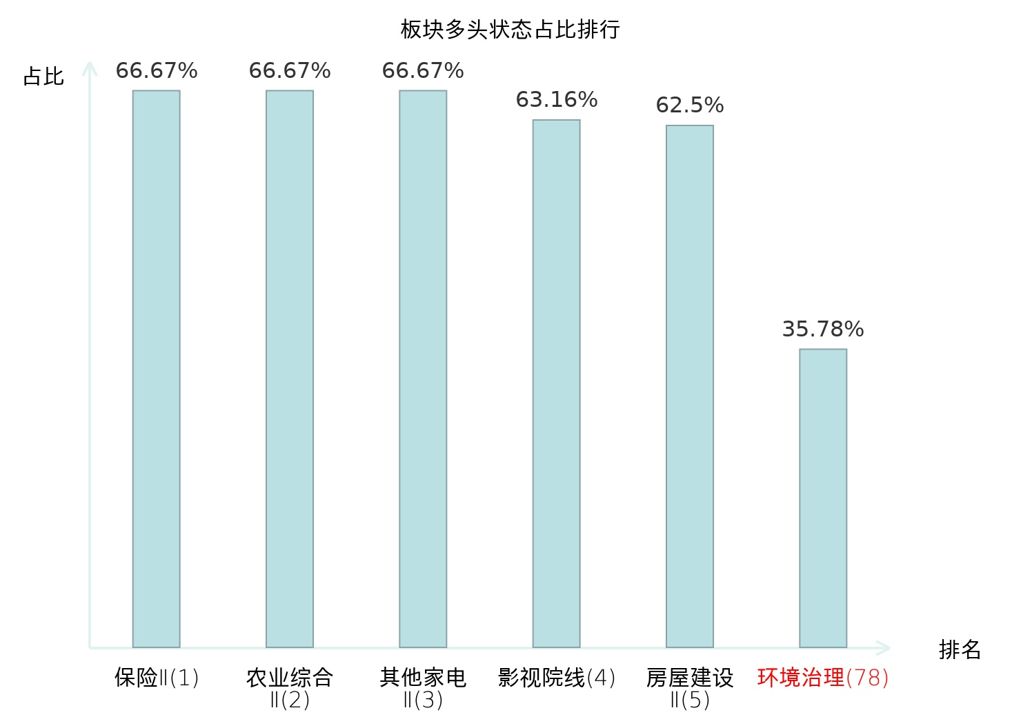 全市场所有行业板块中主力多头状态占比排名中,保险Ⅱ板块位居第一。渔业板块名次提升最快,较昨日上升103位。