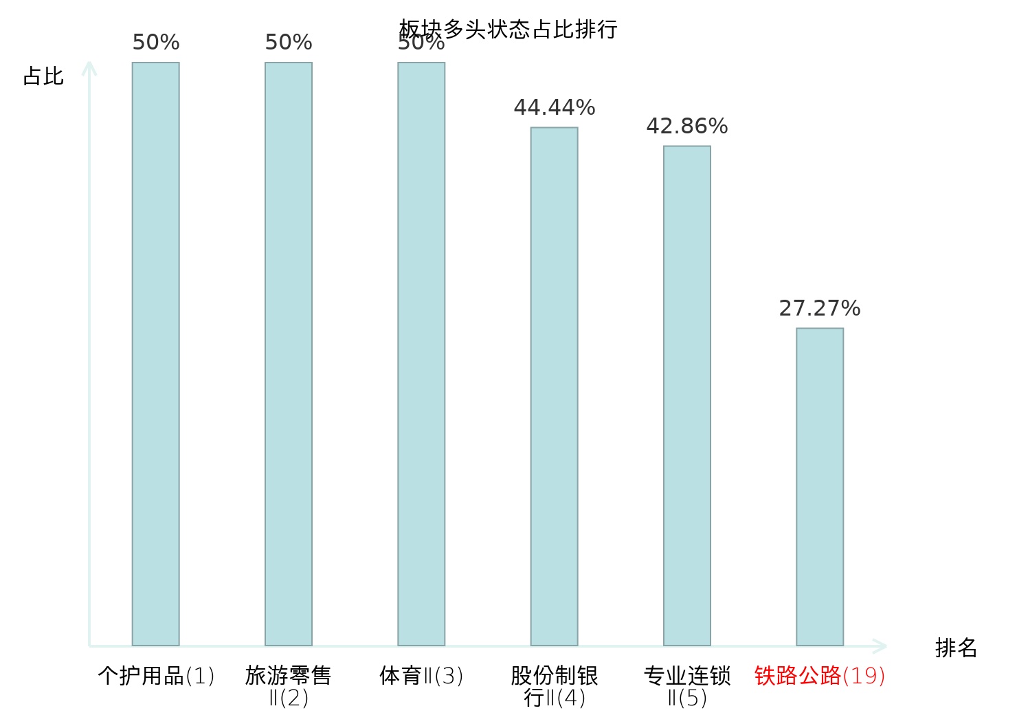 全市场所有行业板块中主力多头状态占比排名中,个护用品板块位居第一。非金属材料Ⅱ板块名次提升最快,较昨日上升37位。
