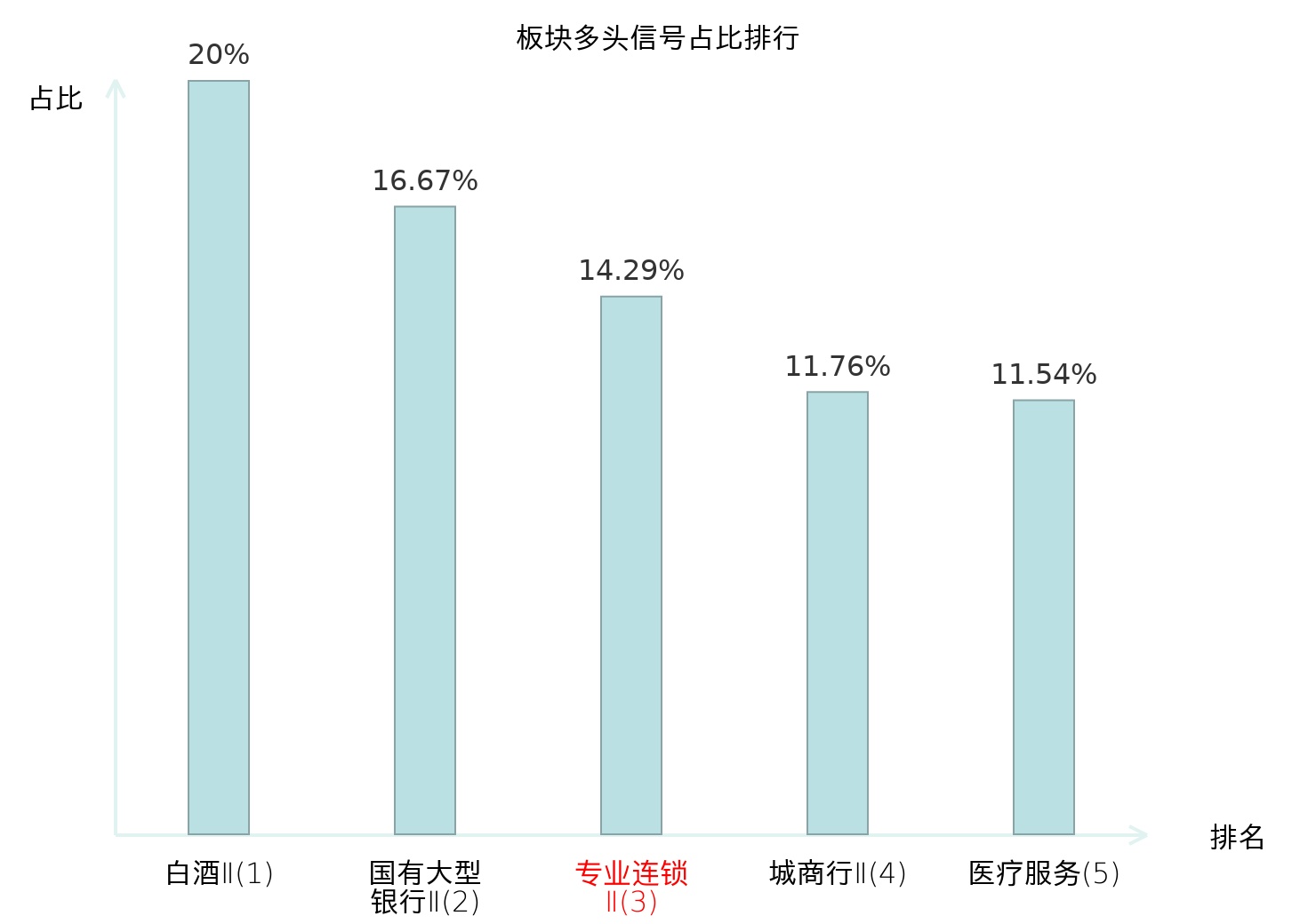 全市场所有行业板块中主力多头信号占比排名中,白酒Ⅱ板块位居第一。国有大型银行Ⅱ板块名次提升最快,较昨日上升121位。