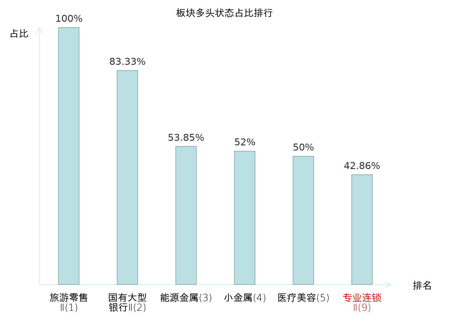 全市场所有行业板块中主力多头状态占比排名中,旅游零售Ⅱ板块位居第一。旅游零售Ⅱ板块名次提升最快,较昨日上升130位。
