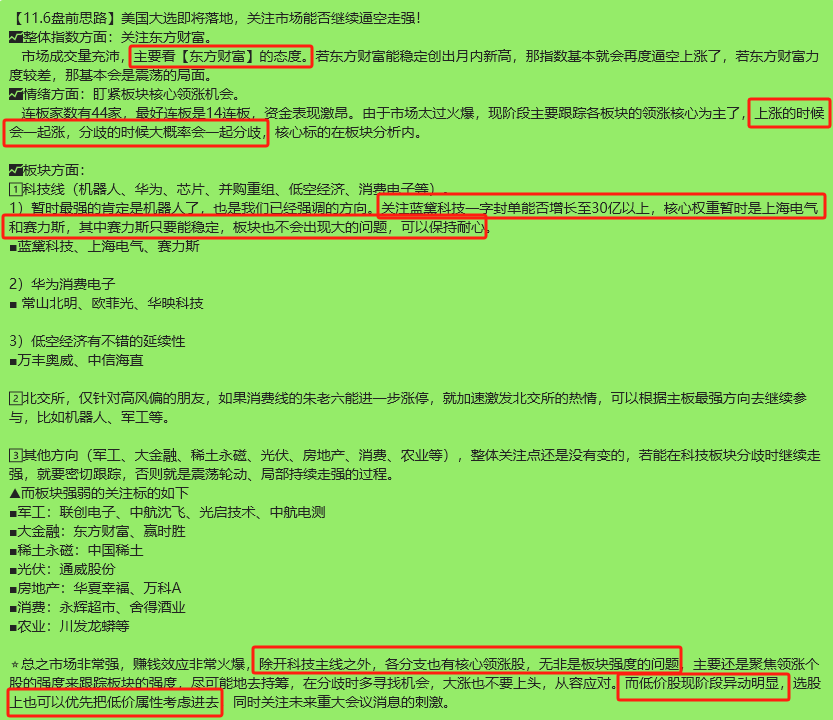 暂时依旧是轮动为主,维持了轮动震荡、局部个股走强的格局,而有消息面刺激的强度会更高一些,比如即将到来的会议等,其中军工就已连续2天强势。同时受美国大选影响,盘中的农业、稀土永磁等都局部的异动,而低价股也有所发酵。主要思路还是没变,若后市能在科技板块分歧时吸引资金大幅领涨,那就高看一眼,否则注意高抛低吸的节奏,连续大幅走弱也要及时撤离。
