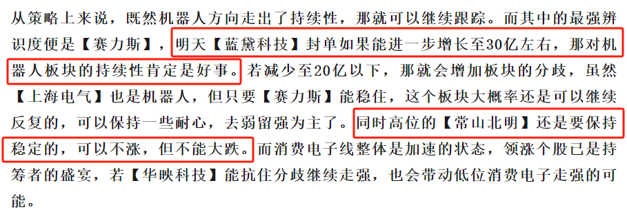 从策略上来说,明天科技线会迎来更大的分歧,【常山北明】预计是高位震荡的态势,所以主要去关注现在活跃方向的抗跌力度,其中首要的是机器人方向,其中【赛力斯】、【上海电气】之一需要保持稳定,而弹性方面密切关注【蓝黛科技】、【机器人】、【科力尔】的强度为主。消费电子则依旧是【华映科技】的强度。若机器人、消费电子板块均大幅走弱,那届时再去跟踪其他逆势活跃的分支方向为主了,与指数爆发的为最佳。