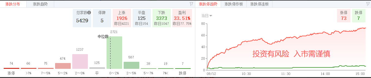 三大指数冲高回落,其中沪指跌0.12%,深成指跌0.43%,创业板指跌1.09%。总体个股跌多涨少,下跌家数达3373家,涨停家数(排除ST)为65家,跌停家数(排除ST)为1家,市场情绪小幅分化。两市成交额总计2.52万亿,较昨日增量832亿,成交量维持稳定