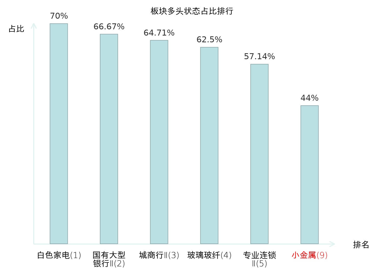 全市场所有行业板块中主力多头状态占比排名中,白色家电板块位居第一。油气开采Ⅱ板块名次提升最快,较昨日上升96位。