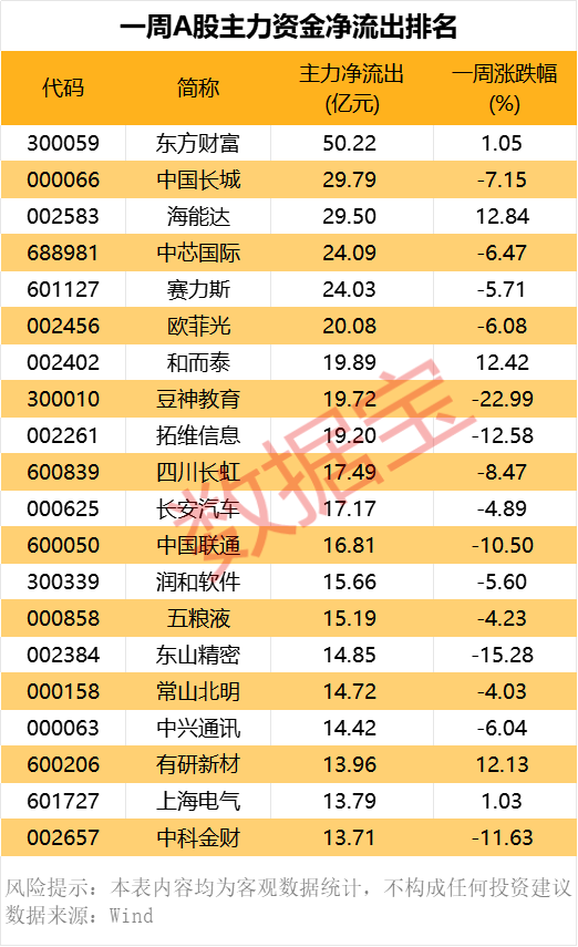 从个股资金流向来看,除去近期上市新股,本周32股主力资金净流出10亿元以上。东方财富净流出额居首,为50.22亿元;中国长城、海能达、中芯国际、赛力斯、欧菲光等股随后,净流出额均逾20亿元。上述6股均为前期涨幅巨大的强势股。此外,四川长虹、上海电气、常山北明等股也均登上榜单,主力资金出逃前期强势股态势明显。