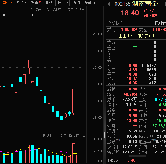 继昨日尾盘快速拉升涨停后,今日湖南黄金一字涨停,斩获两连板。最新价报18.4元/股,50.51万手封单。
