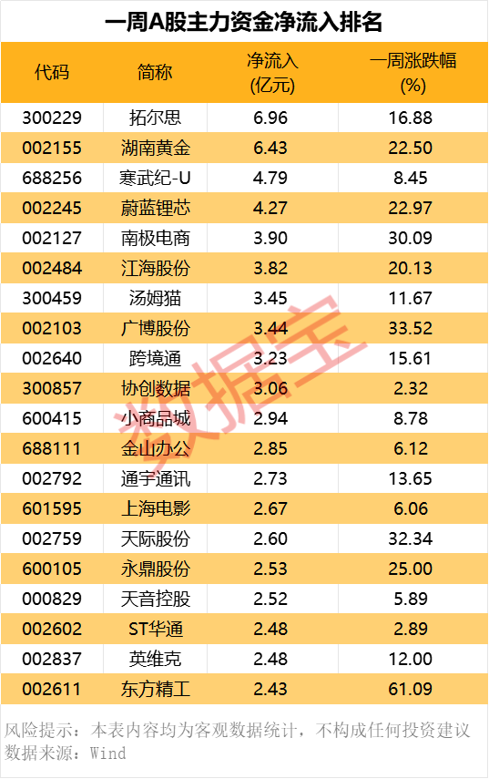 净流入方面,本周94股主力净流入在1亿元以上。拓尔思、湖南黄金、寒武纪-U、蔚蓝锂芯排名前四,主力资金分别净流入6.96亿元、6.43亿元、4.79亿元、4.27亿元。