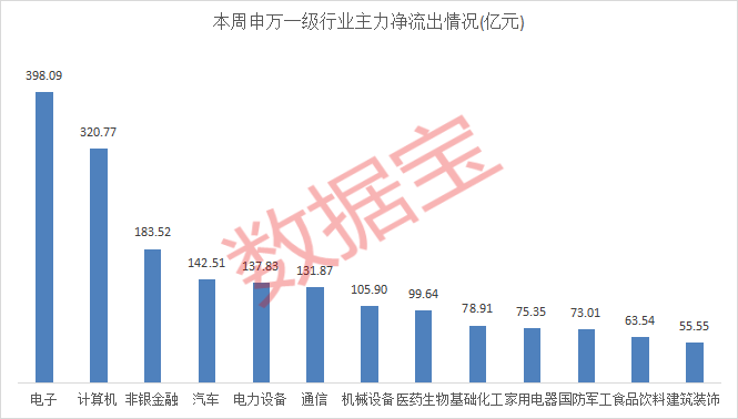 申万一级行业全部遭到主力资金撤离。电子、计算机板块净流出额居前,分别为398.09亿元、320.77亿元;非银金融、汽车、电力设备、通信、机械设备板块净流出额超100亿元。银行、煤炭净流出额较小,依次为2.62亿元、1741.24万元。