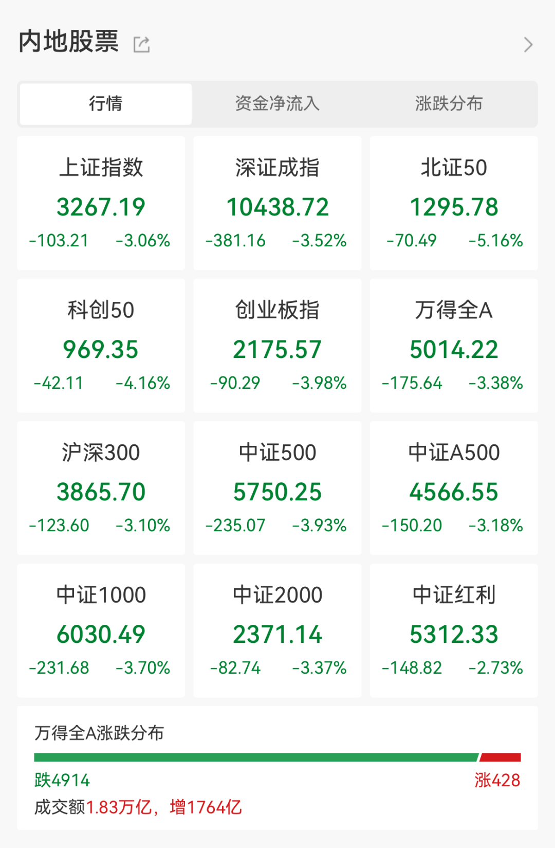11月22日,A股全天低开低走,三大指数午后大幅下挫。截至收盘,上证指数跌3.06%,深成指跌3.52%,创业板指跌3.98%。全市场4914股下跌,428股上涨。成交额18321.84亿元,较昨日放量约1764亿元,换手率4.76%。