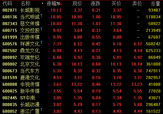 近日活跃的传媒娱乐概念11日盘中延续强势,截至发稿,长城动漫、当代明诚、慈文传媒、文投控股、出版传媒等涨停,祥源文化、鼎龙文化、欢瑞世纪、北京文化等涨幅超6%。