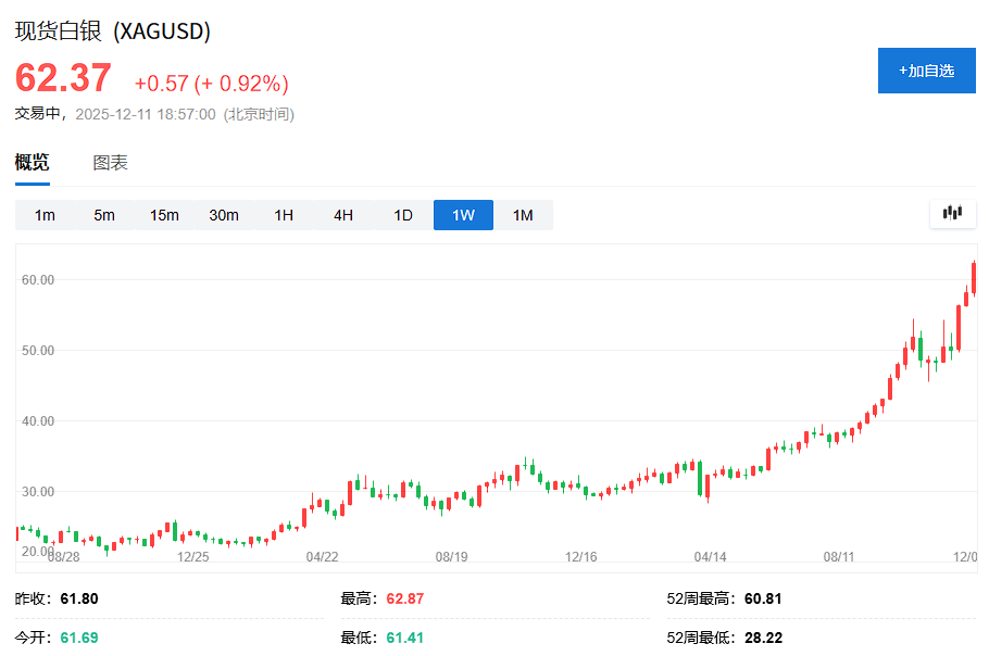 现货白银年内累计上涨114.6%,周三触及每盎司62.88美元的历史高位,截至发稿为62.37美元。白银期货同样飙升113%,本周首次突破61美元关口。一天前,白银刚刚历史性地突破60美元大关。