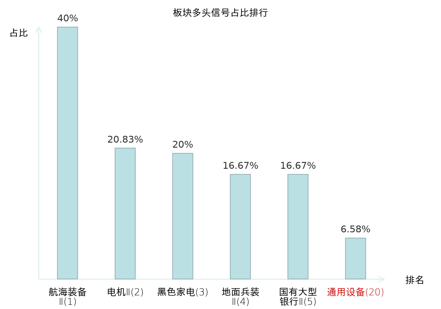 全市场所有行业板块中主力多头信号占比排名中,航海装备Ⅱ板块位居第一。国有大型银行Ⅱ板块名次提升最快,较昨日上升119位。