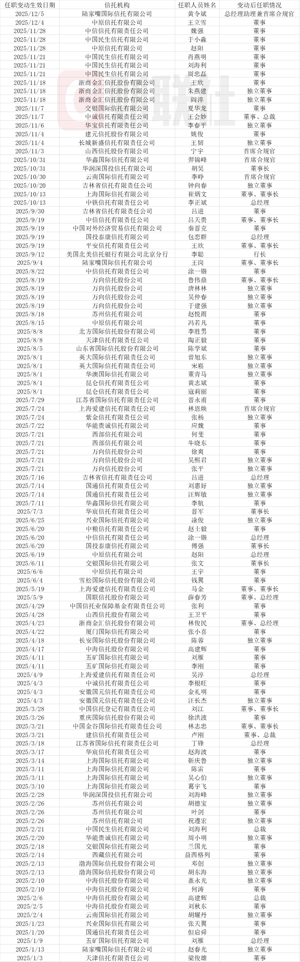 这一实控权的潜在更迭,仅是信托业“大换血”的缩影。据财联社不完全统计,2024年全行业74.6%的信托公司发生高管变动,进入2025年,这一态势仍没有平息 ,截止12月5日,已有48家机构发生核心管理层更迭,其中包括中信信托、平安信托等头部机构。