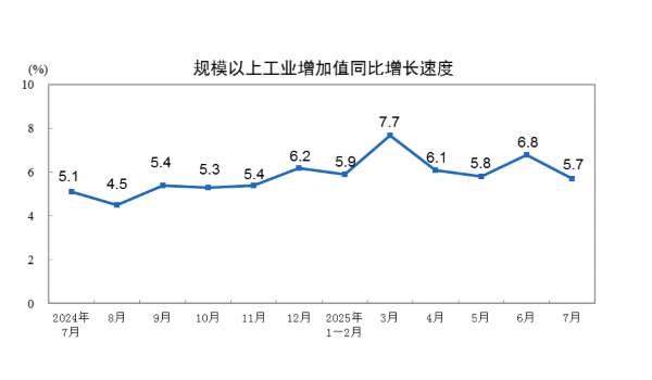 制造业进入淡季叠加“反内卷”下部分行业限产等影响,7月中国工业生产增速略有放缓。7月份,全国规模以上工业增加值同比增长5.7%,环比增长0.38%。分三大门类看,采矿业增加值同比增长5.0%,制造业增长6.2%,电力、热力、燃气及水生产和供应业增长3.3%。