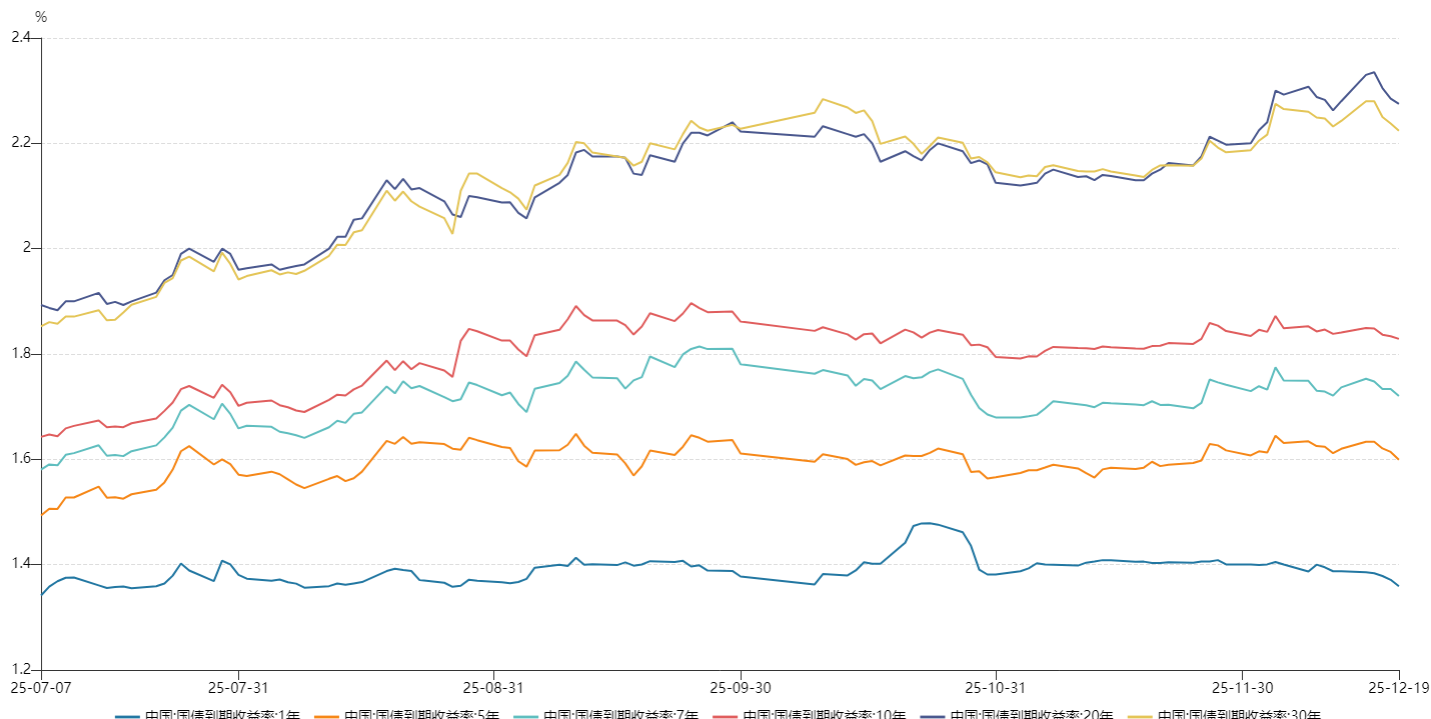上周,主要利率债收益率震荡下行。截至12月19日收盘,1Y、5Y、7Y国债分别报收1.36%、1.6%、1.72%,分别较前一周收盘变动-3BP、-2BP、-2BP;10Y、20Y、30Y国债分别报收1.83%、2.28%、2.22%,分别均较前一周收盘变动-1BP、-0.5BP、-2BP。