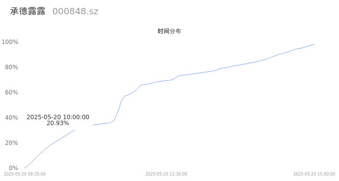 000848承德露露2025年05月20日成交49.05万手,成交金额5.34亿,相较昨日放量11.18万手,换手率4.71%,成交清淡。