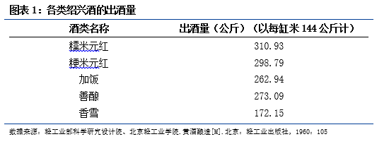 黄酒的酿造以糯米为主要原料,对照图表1,按较高出酒量的糯米元红计算,每100公斤糯米原料的出酒量为215.92公斤。按照绍兴酒平均酒精含量15%计算,可以得到酒精32.39公斤。