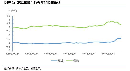 从原材料来看,因为高粱自身具有抗涝、抗旱、耐盐碱等特性而糯米种植需要付出因水热同期要求带来的灌溉及巨量的除虫病害等成本,故而高粱种植成本远比糯米低,二者近五年的价格数据分析结果充分反应了这一点。近五年糯米与高粱的平均价格比为3.09。