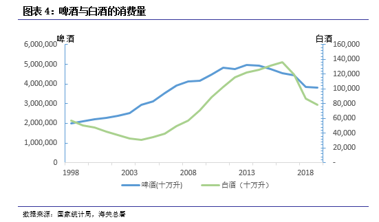 以啤酒为主要代表的低度酿造酒正在挤占白酒的生存空间。作为当下酿造酒的代表,啤酒与白酒消费的对比充分说明了目前它相对于白酒消费的坚实性。可以发现,在2005年左右,“自然灾害”时期形成的新增人口骤减导致了白酒消费主体数量的减少,而当时的啤酒消费却不受影响,甚至是有增加趋势。从日常经验来看,啤酒的消费群体在不同的成年年龄段和性别上的分布并无明显的不均应该是一个重要的原因。