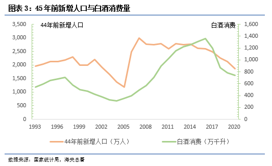 白酒的消费需求主要集中在特定年龄人群。据部分研究成果,成员平均年龄在45-55岁的家庭是白酒消费的主体(闵 师,白军飞等,2012)。对照我国往年的新增人口状况,可以看到白酒消费量和人口出生结构明显的相关关系(见图表3)。这种消费者年龄段集中的现象,是白酒消费习惯培养及其代际传递的阻碍。