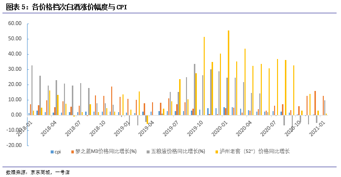 据京东商城和一号店数据,从2017年到2021年,梦之蓝M3整体涨价43.57%,价格年平均复合增长9.46%;同期五粮液涨价67.55%,价格年平均复合增长率13.77%;泸州老窖(52度)涨价72.56%,价格年平均复合增长率14.61%。数据都远远跑赢CPI,这说明白酒的价格涨幅是明显超过期间平均物价上涨的,并且从白酒的消费者组成特性来讲,因特定年龄段的人口减少,这期间白酒的实际需求是在下降的,不存在因产能相对过低导致的供需失衡。